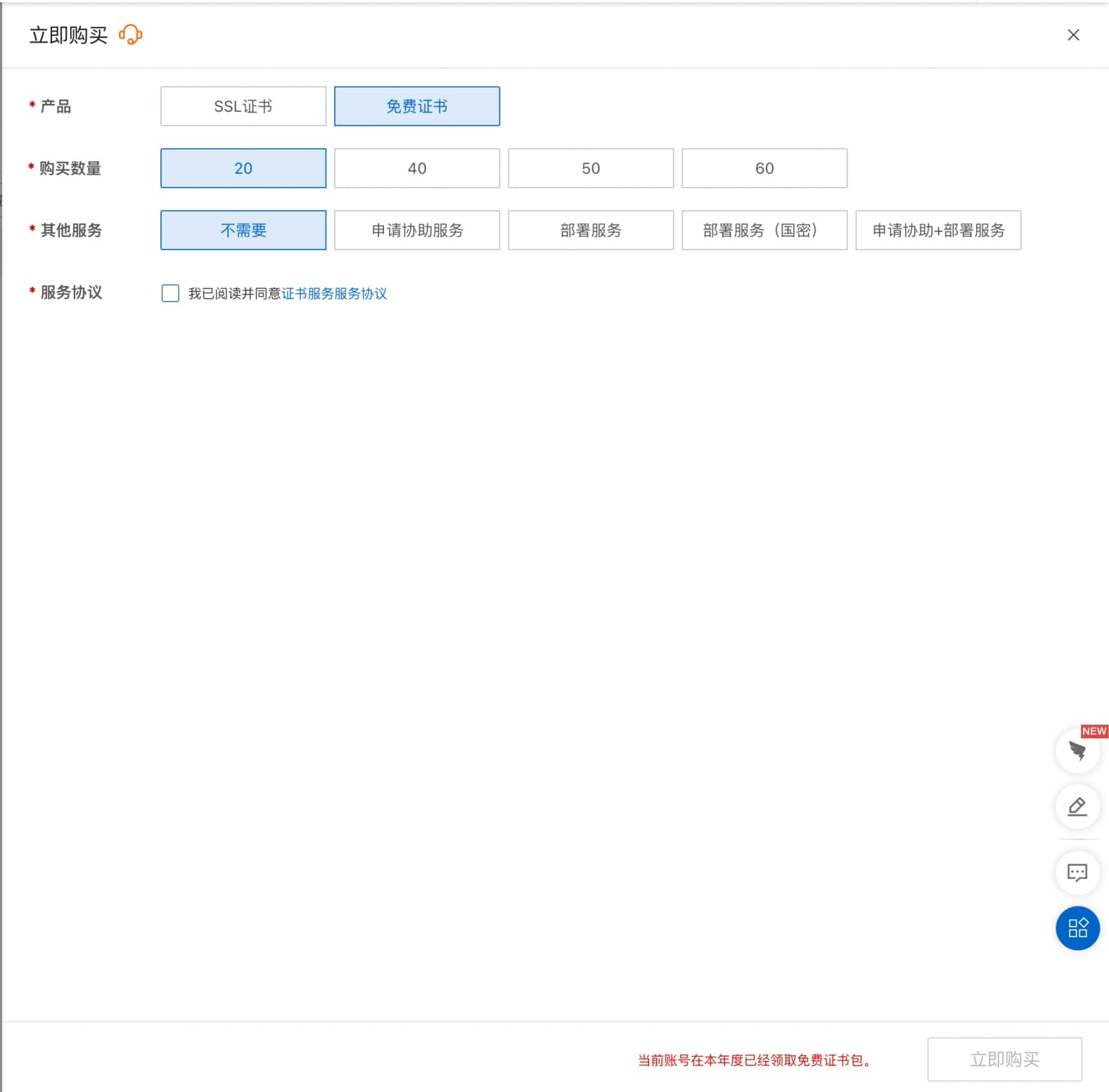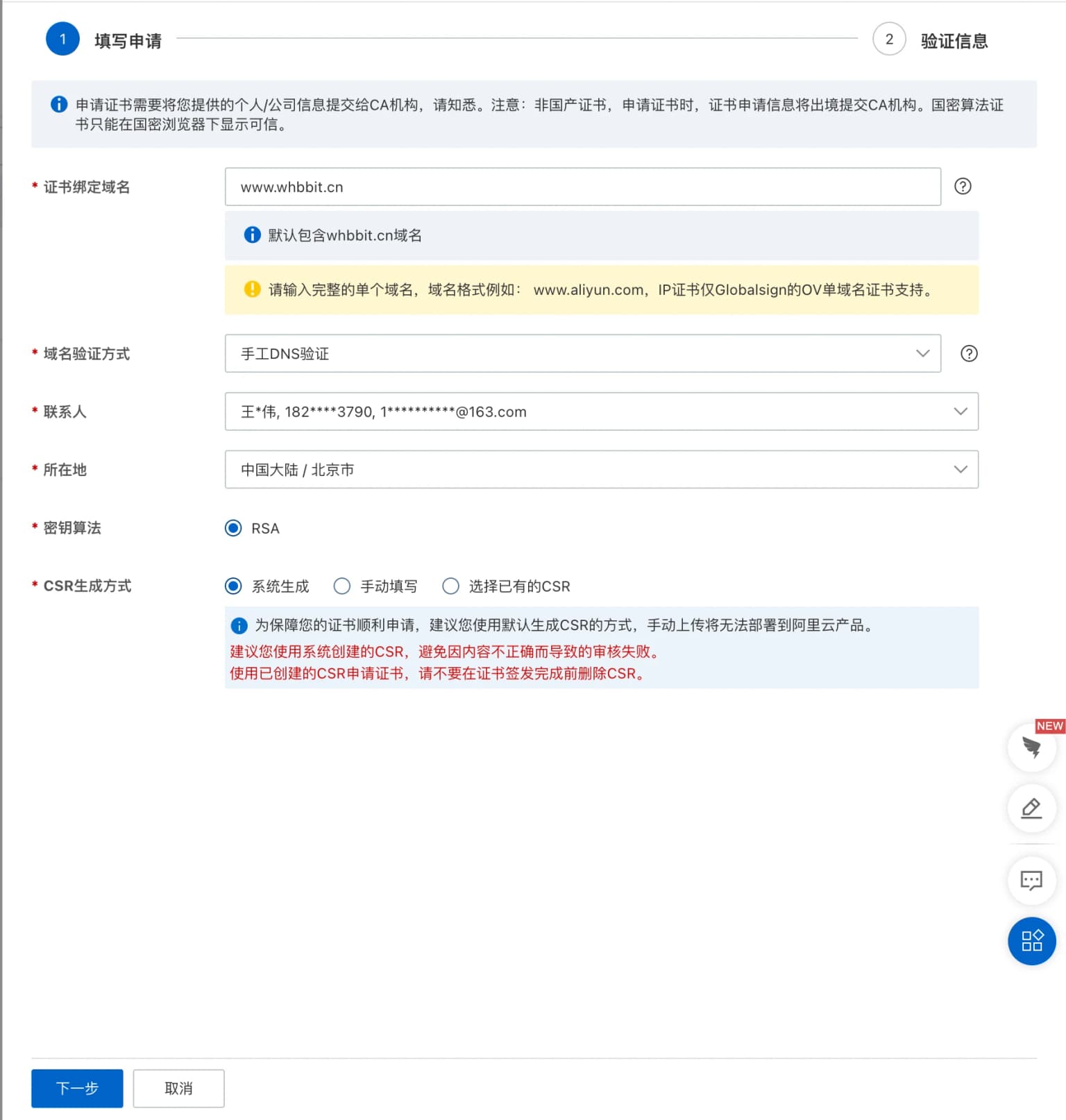 购买成功后,点击创建证书,点击证书申请,在弹出的抽屉里填写你的网站信息