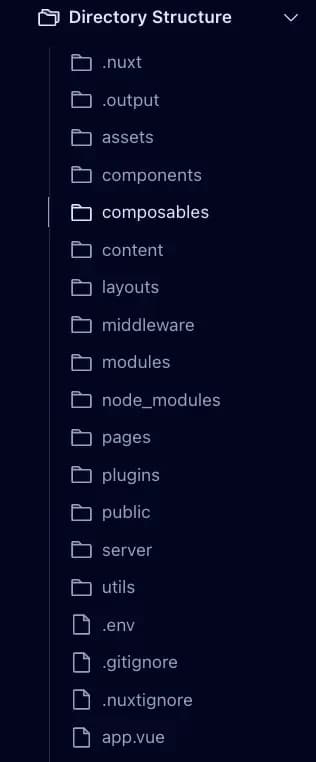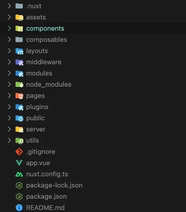 除了 Nuxt 提供的开箱即用的文件结构外,我还建议标准化一些目录。以下是我根据最近开发的 Vue/Nuxt 项目,对一些团队标准目录提出的建议。