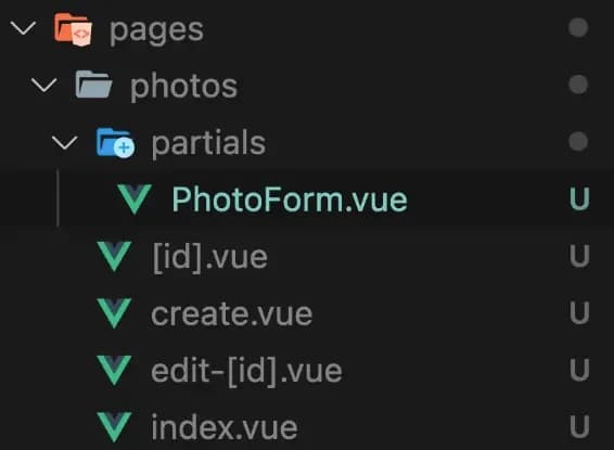 有时,你的组件可能只在单个页面或单个资源的几个页面中有用(例如上文中的 photos 资源)。在这种情况下,我发现将这些组件存储在 pages/[resource (ie. photos)] 目录下的某个目录中会很有帮助,而不是放在 components 目录中。我喜欢把这个目录称为 partials 。它在文件系统中的样子如下: